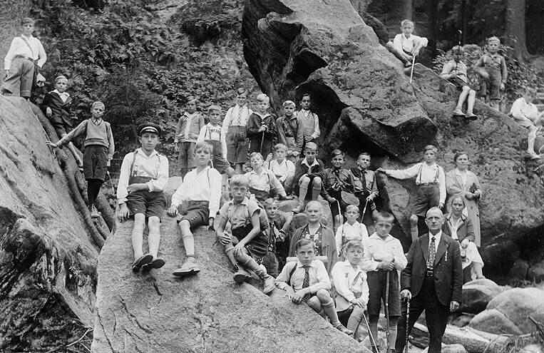 We think that these outings into the country led by teachers were very common in Germany. The photographic record certainly suggests this. We see very large numbers of these groups in the 1920s. Most are undated, but can be roughly dated by the clothes the boys are wearing. These outings may have been fairly common through the 1920s and early 30s. They may have declined after the NAZI take over (1933). This is suggested by the photographic record as most of the outings we have found with teachers seem to pre-date the NAZIs. Perhaps our German readers will know more about this. Teachers may have been concerned about being misunderstood when the NAZIs banned youth groups other than the Hitler Youth (HJ). Even informal assoviation may have seemed rather like organizing youth. Also the HJ program included hikes and other outings which may have reduced the interest among the boys in additional such outings.