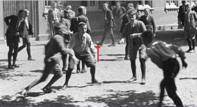 We assume this was a moring recess. The boys don't see to be playing a sport. We did not see any bat or ball, but a sharp-eyed reader spotted one. Rather they seem to be playing some kind of tag game. There is, however, no bat so we're not sure just what the game was. Our reader tells us, "I think they are playing 'catch' I have highlighted what I think is a ball, blurred, as it is in motion and appears to be a very large toe cap