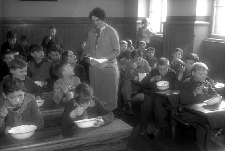 We do not have a lot of information on German school lunches. TYhere must have been differences between primary and secondary schools. Almost all German primary children walked to school. Thus they lived close enough to school to go home for lunch. We believe that many did, but we also know that many children ate their lunch at school. This is because countless portraits show the children carrying a lunch case in addition to their book satchels. The fact that not all the children have these satchels cofirms that some children ate lunch at schools and others did not. We suspect that the parents were given a choice. That was how it was at my American elementary school in the late-40s and early-50s. As far as we know, German primary schools did not have cafeterials until well after World war II. There may have been differences between city and village schools. We suspect that many if not most village children went home for lunch and that many city children ate lunch at schools. This is, however, largely a guess. As far as we know, German elementary schools did not have cafeterias. We see a few images of primary children being served lunch in their ckassroom, but this may have been a temporary matter during the Depression to make sure the children got a least one good meal. Hopefully our German readers will know more. The situation must have been different in secondary scjool. Many German children did not attend secondary school, especially working-class children. This meant that the schools wre often a considerabke distance from home. Some of the children may have walked ot used bicycles, but often they to take public transport likr trams. This mean that many students could not go home for lunch. Even so, I do not think that many secondary schools had cafeterias. Presumably the children brought their lunches to school. A complication here is thst some schools may have operated on shifts, although we think that was mostly after World War II. After the War, Germans built many more modern schools. This was in part because so many schools were destroyed by the Allied bombing. We think that many of these new schools had cafeterias, although this needs to be confirmed. We no longer see the lubch satchels to any extent after the War. Another question is if there were differences between East and West Germany. West Germany of course was more affluent, but East Germany incouraged women to work more and took on greater responsibilities in child care where it was necessary to provide meals.