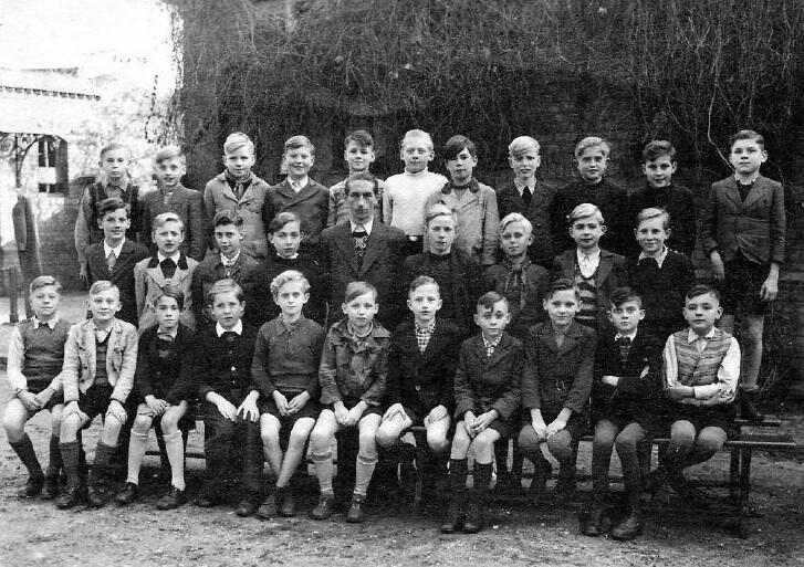 We do not immediately see differences between schoolwear in East and West Germany after the end of World War II and the beginning of the occupation. The children continued wearing their regular clothes. This at first was the same as worn in the Western occupation areas. This gradually changed as the German Economic Miracle took hold. West Germans with much higherr discretional income were able to spend much more on fashionable clothing. Thus West German boys had much larger wardrobes of more fashionable and higher quality clothing. There seems to have been some similarity in styling even as East Germany took more anod more steps to separate the two Germanies ecomomically and culturally, symolized by the Berlin Wall and extension to the East-West German border. East Germans could, however, receive West German TV and radio and there was of course no language problem. Thus fashions trends in the West tended to flow over the Iron Curtain, especially into East Germany. This is an interesting dynamic to follow as we acquire more East German school images. The first obvious difference at school is the red Pioneer scarves that the children began wearing. We can see a few in the 1950 school portrait here (figure 1).