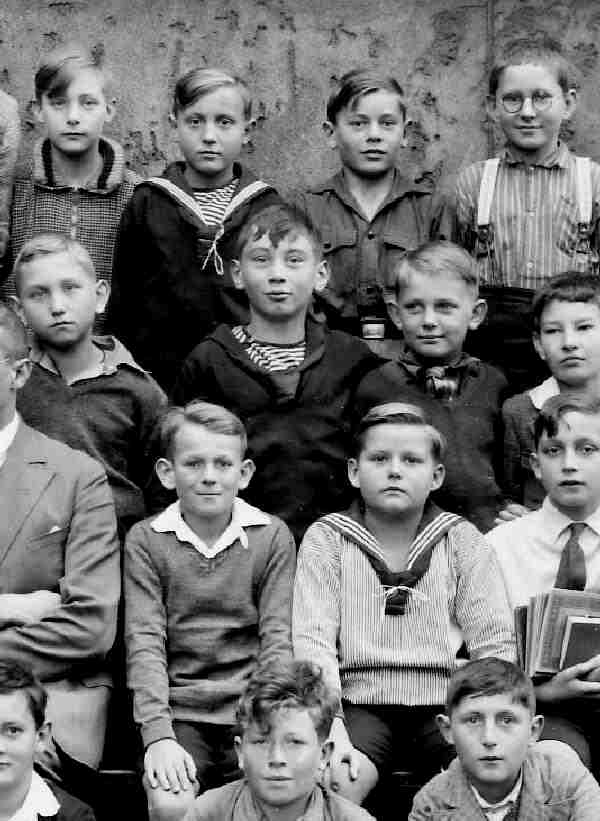 Throughout the Weimar era, most German school classes, ecept the last year of secondary schools generally include a few children both boys and girls wearing sailor suits. The cass here was no exception. As was very common in the 1920s, a few boys wear sailor suits. They are all traditionally styled suits. Most are dark suits. We note one boy with a stripped middy blouse. This was more of a summer style. Some of the boys wear their miffy blouses with the dickies, others without. All wear their scarves tied in the same manner. This was quite common in Germany. We do not know what kind of caps these boys wore.
