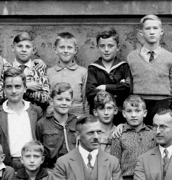 We think that this school was probably located in northern Germany. There is no way to be sure of course, but one small detail catches our eye. We only see one boy wearing an h-bar halter. This was a very common style, often worn with Lederhosen in southern Germany, especually Bavaria. These halters and Lederhosen were much less common in northern Germany. Leaderhosen and haltars were still very regionl in the early 1930s. Here the boy's halter is almost covered up, but a flower design can be mase out. This means that it was likely a proper leather halter, the kind worn with Lederhosen, and not h-bar shorts.