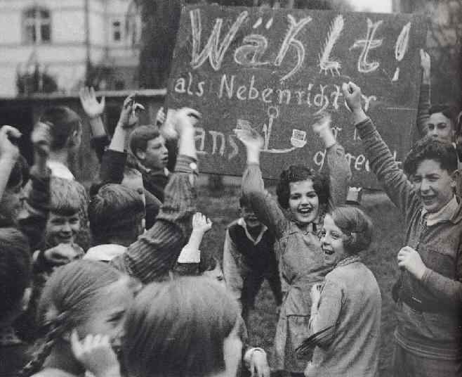 These German school children are participating in a school election, rather like an American student council election. The sign reads "Wählt als Nebenrichter Hans and then "er ist gerecht(er)". Meaning they should vote for Hans as a associate judge because he's (more) fair. Note that one boy even gives a Socilaist salute (the clenched fist). The photograph looks to us as it was taken in the early 1930s. No doubt when the NAZIs took over in January 1933 elections like this were quickly ended.