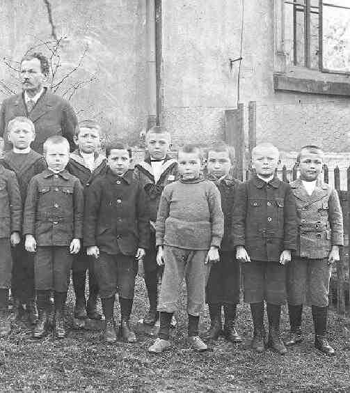 This German school portrait is unidentified. It shows a class of younger primary boys with their teacher. We would guess that it was taken about 1920. It looks to be a class from a rural village school. The boys look to be younger primary boys, about 7-8 years old. Many of the boys wear the suits that buttoned at the collar without lapels. Some boys wore sweaters rather than suits. I think these were generally the boys from less affluent families. All the boys wear knee pants of varying length with darklong stockings. Some of the boys in the class wear sailor suits. Many but not all of the boys have close-cropped hair.
