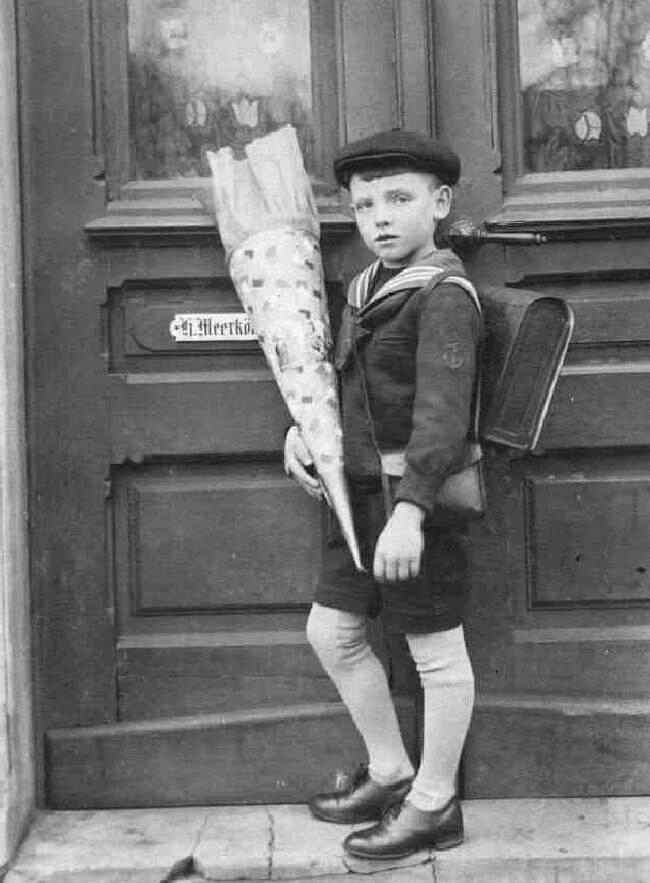 Figure 1.--I think this first day snapshot dates from the later 1920s. I think it was dated 1927 or 1928. Unfortunately the boy is unidentified. The boy looks to be at least 6 years old--possibly nearer to 7 years old. I'm wondering if the name "Meerkoff" on the door plate represents his family name. And we do not know where in Germany the boy lived. It is interesting for a number of clothing features illustrated. Image courtesy of the BP Collection. |