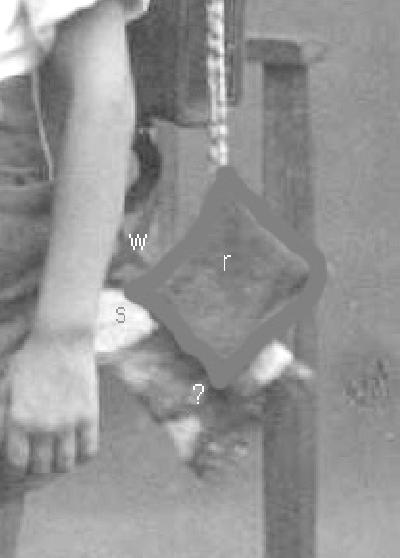 occupants sit back to back. The seat of the chair is seen to the right of the boys wrist and looks like a whitish kind of fabric from the seat of the chair (marked s on the pic). Above that is is the woodwork of the chair’s back (w). To the right is a lozenge that I’ve marked with a gray paintbrush (r). To me it looks like a kind of 'eraser’ (American : duster??) made of terry cloth. Underneath is is another lozenge with a checkered pattern, either lying on the edge of the seat or hanging from the string that’s passing behind the upper lozenge. What are they? Two rags, one wet, the other dry, at either end of the string? Or just one rag, hanging from a bow string and a piece of cloth (a shawl?) lying on the chair? There seems to be fringes on its right lower edge. I cannot make out any ‘substantial garment’ for if so its fabric would have to pass behind the boy’s back and there, in my opinion, are the woodwork, the seat and, just underneath it, a small horizontal bar being part of the chair’s framework. I wonder what you think of this. Perhaps the final solution will have to come from one of your German readers.