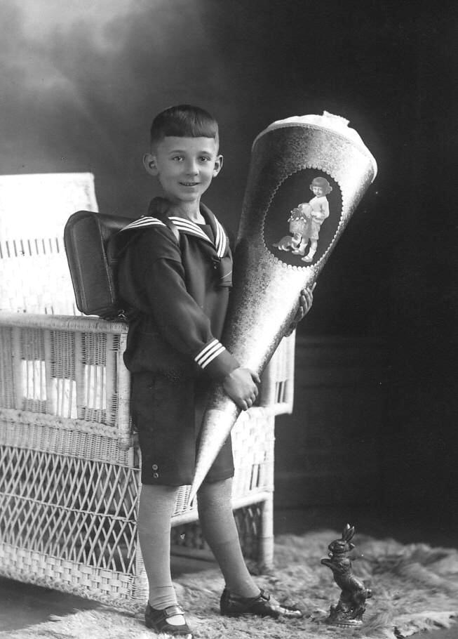 The German school Zuckertüte goodie cones in the 1920s were fairly standard in shape and decoration. They were all cone shape. The decorations included images of happy children. They do vary in size. There seem to have been three popular sizes. We see large cones as large as the children themselves. There were also medium-sized cones about half as high as the children. And finally there were smaller cones about a quater the heighth of the children. The medium cones seem to have been the most common. They contained candy treas, small toys, and school supplies. Unfortunately almost all of the portraits are of the children with their cones before the children get inside to enjoy their goodies. Apparently the children took the cones to school and did not get to open them until after school. We would love to see a photograph of the children taking the items out of the cones so we can see what was inside. German parents seem to only wanted a portrait of the children with the cones before they were opened or perhaps after they were opened. But the idea seems to have been to shown the child and cone and not what was inside.