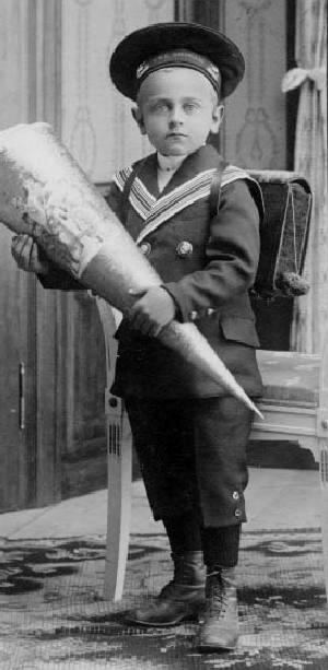 Images from the early 20th century show that the school gift cones were a very popular custom. We are unable to assess just how popular. We do have several images from the 1900s, although not as many as after World War I. But this may simomply reflect the fact that our archice is much larger for the period after the War. We are not sure yet just when rhis custom began. We are not positive about the chronology of these cones. The custom of giving these cones appear to have begun in the late 19th cenury. The photographic image we have begin at the turn of the 20th century. This suggests that this was when this custom began widespread. A German reader writes, "HBC uses Zuckertüte for it, a term I'm less familiar with, but it's also used. These Schultüten are common since the late 19th century, they first were hung on Christmas trees, besides other items, later they were used as special present to sweeten the first day at school." The boy here, we think in 1908 wears a sailor suit. This was popular schoolwear.