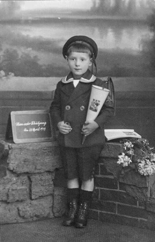 We are not yet sure how common Zuckertute were in the 1910s. We have quite a number of images we think could have been taken in the 1910s, but as they are not dated, we can not be sure that they are from the 1910s. Many may be from the early 20s. The 1910s included the World War I era. The difficult economic conditions would have reflected traditions like this. Candy in particular became hard to get. Sugar was a product Germany imported and these imports were largely cut off by the Royal Navy blockade. And the Zucker in Zuckertute meant sugar. We do not have a lot of Zuckertute portraits during the 1910s, but we have found a few. Some of them show very small Zuckertute. As we have relatively few portraits from the 1910s, we are not yet sure how common this was. Perhaps in the scarcity of candy in Germany during and after the War. Notice that that the Zuckertute here was not even filled to the top. Or perhaps the boy has already eaten the candy. One curious aspect here. Notice the date--April 28, 1919. At the time, school in Germany began in April. A German reader tells us, "Yes, in former times that was correct. School started after Easter. Nowadays it starts in August or September after summer hollidays.