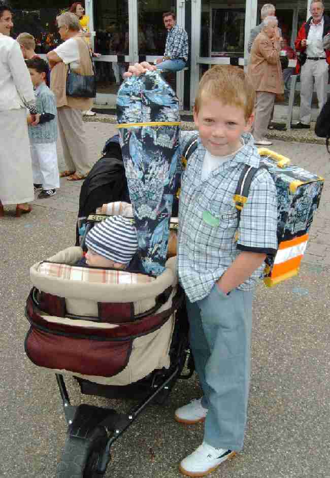 At school the children are not allowed to open them. AFTER the first school day they can open it and eat lots of those sweets. This happens while walking outside the school because the children are too inpatient to waiting until they get home. I can remember when I had my first school. The teacher told us to draw our Schultüte and it was homework to finish this picture for the next day." [Grosser] A German reader tells us in 2009, "This week I saw lots of cute school starters with their cones. Seems to be a trend now to use selfmade cones. You can buy many kits for that now."