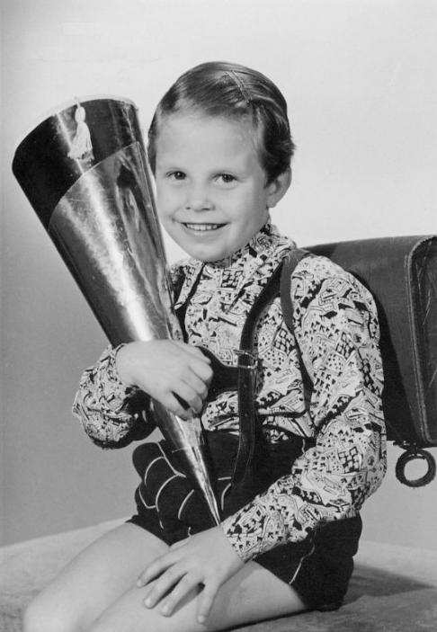 A popular tradition in Germany was to photograph a child's first day at school. These portraits provide valuable time capsules of German school clothing. Subsequent school years are less commonly photoigraphed, but virtually every German child had his or her portrait taken thatv first year.n Before World War II we note many studio portraits. After World War II we note more snapshots. Also after the War we note quite a number of boys wearing Lederhosen for these first day photographs. This seemed much less common before the War, except perhaps in Bavaria. A good example is an unidentified boy in 1957.