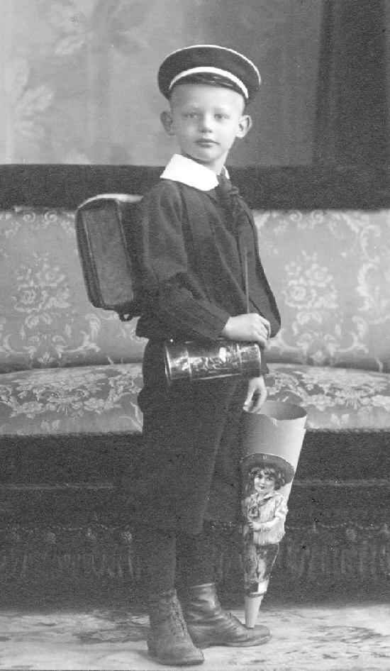 Much of our information comes from the photographic record. These little leather satchels see common in First Day portraits for the younger children. We do not see them very commonly with older children. Thus they seem to be strongly associated with younger children. This is confirmed by the fact that a term for them was Kindergartentäschchen. We know, however, that they were notg just for Kinndergateners. We see younger primary children with them as well. The unidentified boy here in his First Day porteait is a good example (figure 1).