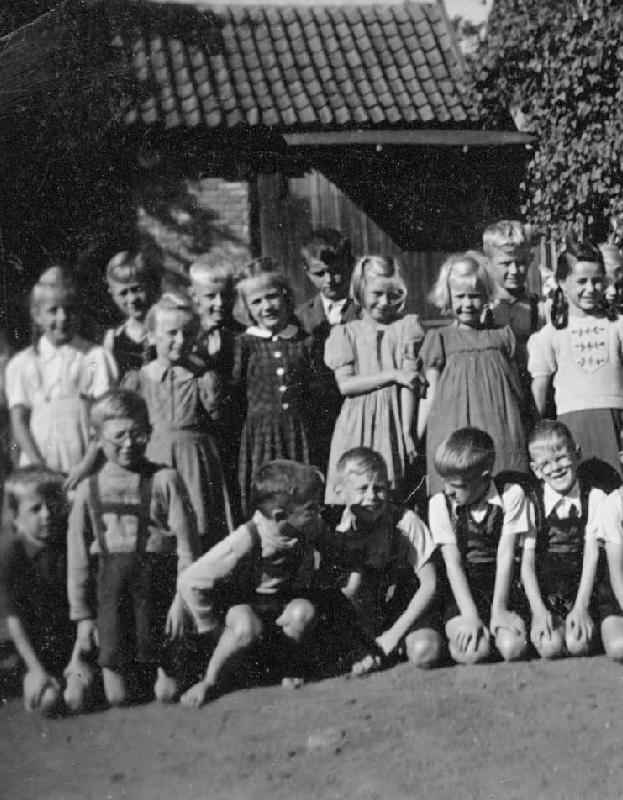 This photo was taken in 1952 (figure 1). It looks to be a small primary school. Saxony was in East Germany, but Lower Saxony (German: Niedersachsen) was in West Germany. The children look to be about 8-9 years old. Most of the boys wear short pants, many H-bar or suspender shorts. The girls all wear dresses. Some of the children are barefoot, but we can not tell how common this was.