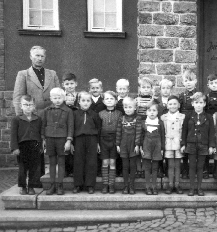 This is an interesting photo taken of the first grade class (all boys) at Diesterweg School in Werdau, Saxony (East Germany). Saxony was part of East Germany during the Communist period. The class portrait looks to have been taken in 1953. The teacher with the boys is Herr Tenzler. This would have been a Volksshule (primary school) , but we do not know if the East Germans changed the terminology. The boys are standing in front of their school. The door bears a motto promoting the Young Pioneers, the Communist Youth Group, which translates as "Young Pioneers make Men." Most of the boys are in short trousers and long stockings with German garter waists (i.e., Strapsleibchen with four hose supporters). A few boys are in long pants gathered at the ankle, which was the alternative to short trousers. There was no set uniform. The boys are just dressed like German schoolboys in most of East Germany. East Germany kept long stockings in style somewhat longer than West Germany.