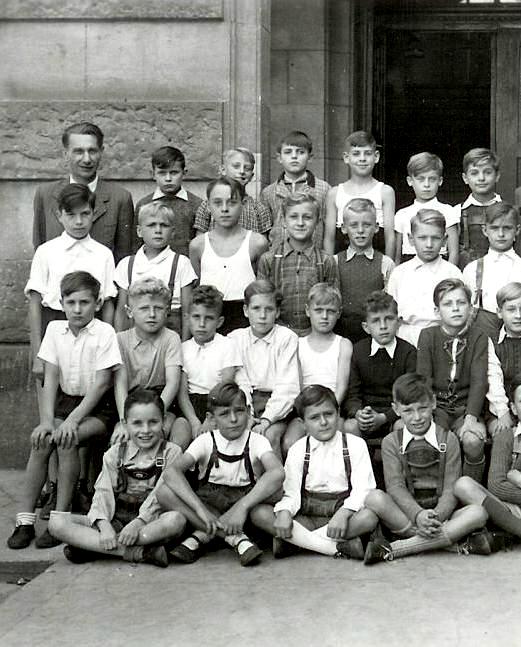 The class portrait here was taken in 1949. It is a Gymnasium 1st grade class, meaning the fifth year of school in the German school system. This would mean that the boys were about 10-years old and had just finished Volkshule. Gymnasium was a selective secondary school, rather like a British grammar school. Before World War II, many German children did not attend secondary school. Most working-class did not go on the secondary school. This changed after the War when the secondary system was significantky expanded. We are not entirely sure when the changes were implemented and what the status of the educational reforms were in 1949. The boys are wearing a variety of garments, formal and casual. Two boys wear very formal jackets, while five of their mates are wearing only undershirts. We commonly see German boys wearing a variety of clothes, but we have not noticed wearing singlets to school before. Perhaps it was a hiot day. Or perhaps this was a reflection of the still difficult post-War conditions. Another possibility is working-class children beginning to attend Gymnasium.