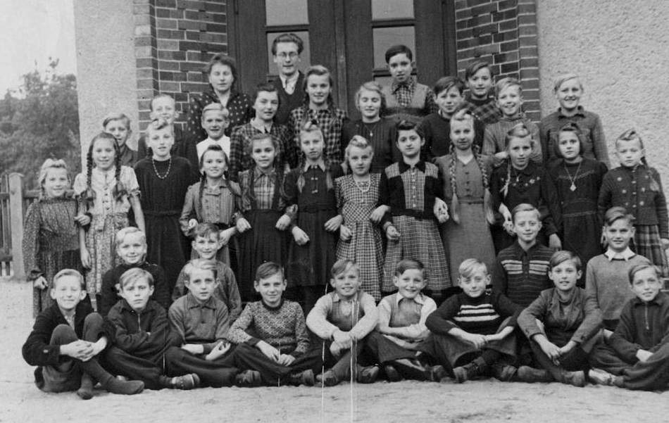 Skerbersdorf is a village in Saxony located close to Silesia (one of the modt fought-over proivinces in Europe) on the Lusatian Neisse River. The area was settled by Germanic tribes and then Slavic tribes when the Germans moved west. Charlemagne in the Saxon Wars began the Christinaztion of the Saxons (8th century AD). We are not sure when the first written records of the village appdear. Developing trade routes made the area important and many battles were fought resulting in substantial destruction. The area was devestated by the Thirty Years War (17th century). Skerbersdorf is located in the southeastern portion of East Germany, very close to the post-World War II Polish frontier. We note several portaits taken in the village school duting the post-War era. A reader writes, "Did you notice that several of the girls wore top curls? At least eight girls in that first row of girls (second row) had these top curls. I thought that was striking." Probably that was more of a local fad than a national style. Interestingly, more girls have these top curls than the braids with which German girls are more associated. We suspect that in the days before all pervasive media that fashion trends like this developed in schools, especially as no purchases were required.