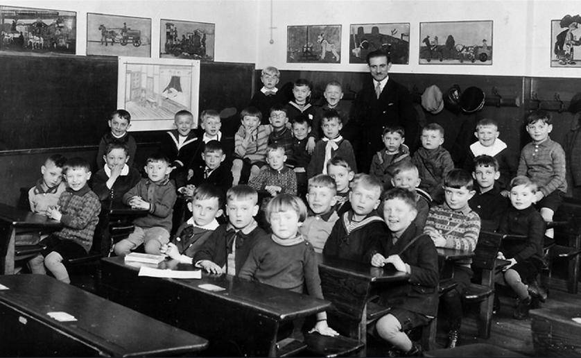 This is a Volksschule primary school class in Weissensee (a district of Berlin) taken in 1935. We would have guessed that they were the youngest children in the school. German children began Volkschule at age 6 years. The source referred to as the second class. If this means the the second year, then the boys would be about 7 years old. The class seems to be only boys. There is a pupil in the first row with rather longish hair. Most boys had their hair cur short for school, but we occassionally see a few boys with longer hair. Several of the boys are wearing sailor suits. Some have white collars and bows. This was becomong less common in the 1930s, but the younger boys still wore them. Here there were probably social class factors involved. Volksschule is interesting because children of all social classess and abilities attended. Germany at the time was still a very class-stratified society. Voksschule was until 1933 virtually the only time and place where Germans from varied class strata intermingled on an equal plane. (With the NAZI take over, Hitler introduced other such expeiences, the Hitler Youth, the Reichsarbietsdienst, and finally the Wehrmacht.) Private schools were not very common and not academically more demanding than state schools. We suspect that the boys with white collars and bows, sailor suits, and longer hair were from more affluent families. They all are wearing short trousers with long stockings (with the traditional Leibchen--bodice and supporters). They look quite happy. Notice the male teacher standing at the back of the class. Most boys had male teachers even in the early primary years. This did not begin to change until World War II. He has taken pains to decorate the classroom with images the boys would enjoy. The pictures around the room appear to involve horses and farm animals. Notice the school caps hung on hooks at the back of the room. Also notice that the room is completely filled up with the boys' desks. There would have been no moving desks around for varioed learning activities.