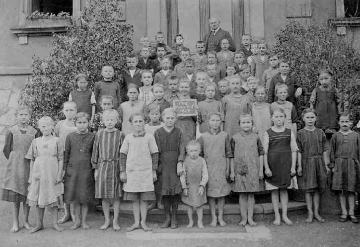 The photo shows the last grade class at the village school. It was a substantial brick building. The class has 24 children, 11 girls and 13 boys. They look about 12 years old. The girls wear rather long dresses. The bots wear shirts, some with sweaters or suit jackers. All the boys wear short pants. Only two boys thst we can see wear knee socks. Two boys in front wear sandals, open-toe sandals, and one is barefoot.