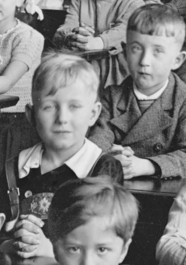 At least one boy wears lederhosen. He is the only boy I note wearing lederhosen. Lederhosen were at one time a regional garment, but by the 1930s were more widely worn. Still they were most common in Bavaria. This suggests to me that the school may be in northern Germany as in Bavaria and the Alpine areas more boys may have worn lederhosen. His haltar seems rather fancy with a bold design. Only the haltar can be seem, but it is very likely that he is wearing lederhosen. He wears it with a little different shirt than I have commonly seen. The large white collar seems to be buttoned on to a black shirt. The shirt has large white buttons.