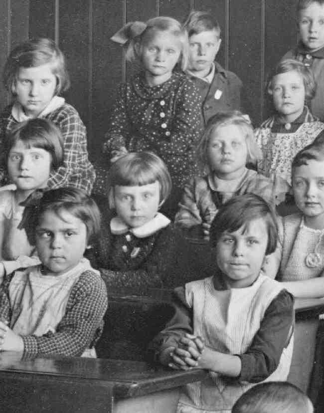 All of the girls of course wear dresses. About half of the girls wear pinafores over their dresses. The pinafores are all very plain styles. One girl wears a knit dress--almost certainly knitted by her mother. Two girls wear white Peter Pan collars. I only see one of the girls earing a badges like many of the boys wear. All of the girls have short hair styles. We also note a few girls wearing hair bows.