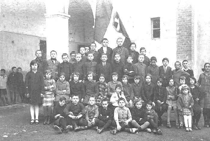 Figure 1.- Here we see the Ozzano Monferrato, near Turin, in 1913. It looks like a primary school. There is no uniform. The girls wear dresses, mostly with long stockings. Neither the boys or girls are wearing smocks. The boys mostly wear suits. They are mostly the old fshioned suits that button at the collar, but we see some that have lapels as well. |