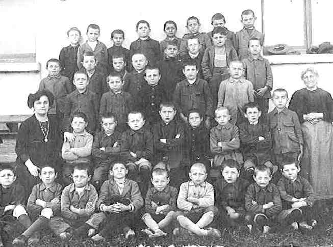 At one primary school, the Missaglia School, near Milan in 1922 the classes are divided by gender (figure 1). Here we see most boys wearing suit jackets, the old type which buttoned at the collar. We see only a few boys with the newer style that had lapels. A few boys wear sweaters. Note their hats on the window seel. Most boys wore long pants, but we see some boys wearing short pants as well. Here we believe social class factors were significant. We see boys wearing boy kneesocks and long stockings. Benito Musollini and his Fascists began their take over with the March on Rome (1922). Notice how many of the boys have close cropped hair. Also notice that there are women teachers. The woman at left is presumably the teacher. I'm not sure about the woman on the right. I thought she might be a classroom assistant, but an Italian reader says she is more likely to be the school caretaker.