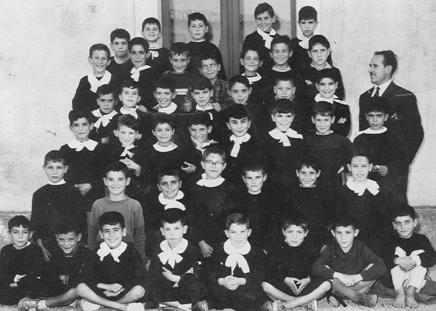 Few Italian children wore school uniforms. School smocks were, however, still common in Italy during the 1960s. And that was a kind of school uniform. Many Italian primary children in the 1960s wore school smocks,. often dark blue smcks as you can see here (figure 1). The boys mostly wore short pants. The girls wore dresses. The smocks commonly were worn with shite collars and small floppy bows, but this varied somewhat from school to school, both the rule and ebforcement. An Italian reader tells us, "The dress code was stated by provincial school offices and the individual schools. In my school near Milan in the mid-1960s, boys wore black smocks with white collars and blue bows, while girls wore white smocks with white collars and pink bows. The bow was optional during the last two years.