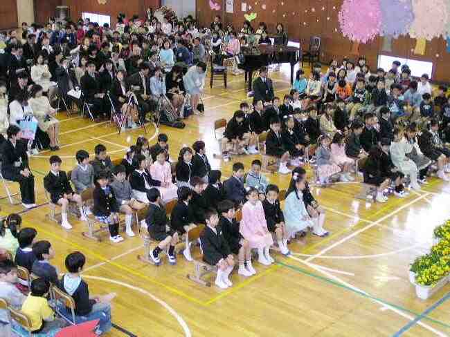 A ceremony of considerable importance is when children begin primary schools. Japanese schools have special ceremony for the new children beginning school. I don't know a great deal about the ceremony at this time. The ceremonies vary from school to school. There are some common elements. I believe the older students often welcome the new children to their school. Parents attend to watch. The ceremony normally takes place in the school gymnasium converted into an auditorium for the ceremony. Folding chair are brought out for all those attending the ceremony. There are flowers, often cyrsanthums to decorate the gymnasium. This is certainly a major event in the life of every Japanese child. The new children may be presented to the whole school in thie ceremony. The parents or at least the mothers are present in the audience. I think it was common to have a portrait taken. Often an older student after the ceremony is assigned to help the new student learn about the school.