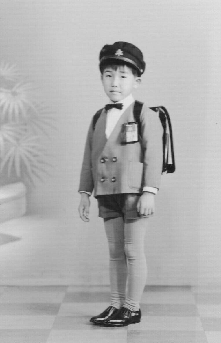 Here we have another portreait taken about 1960. The portait has a 1950s look to us, but if so would hsve been tsken in the late-50s. Japaneese boys until the lte 1950s were wearing longer shorts. Only as they neared the 60s do you begin to see these short cut shorts. Whgat look o be long stockings also can help date these portraits. The same is true for what we think may be long stockings. It was aboiut 1960 thar tights wetre replacing long stockings. The hise here look a litle too baggy for tights. But they would have to be very long-length long stockings. The boy wears a student cadet cap, collared white shirt with bow tie Eton jacket and matching s=hort pants, long stockings and black leather shoes. We are not sure about colors. He is wearing his school backpack. This double-breasred look for =E=Eton jackets seems popular at the time.
