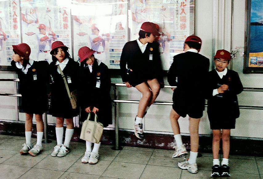 We see Japanese children wearing both the same headwear and gender destinctive headwear at various schools. The younger boys and girls commonly wear the same style caps and hats. This was the genderal convention in nursery schools and kindergardens. The general convention in primary schools was to have gender destinctive headwear. Most of the schools we have seen have gender-destinctive headwear, especially the uniform schools. This is interesting because the boy and girl uniforms are often quite similar. The major difference is that the boys wear pants and the girls skirts. We think some primary schools may have the same headwear for the children, but we have not yet found examples. This is most likely to be at the non-uniform schools. Often these schools did require the children to wear uniformn headwear, often brightly colored so they stood out in traffic. The students at secondary schools as far as we know always had gender destinctive headwear, commonly the cadet caps for the boys and sailor hats for the girls.