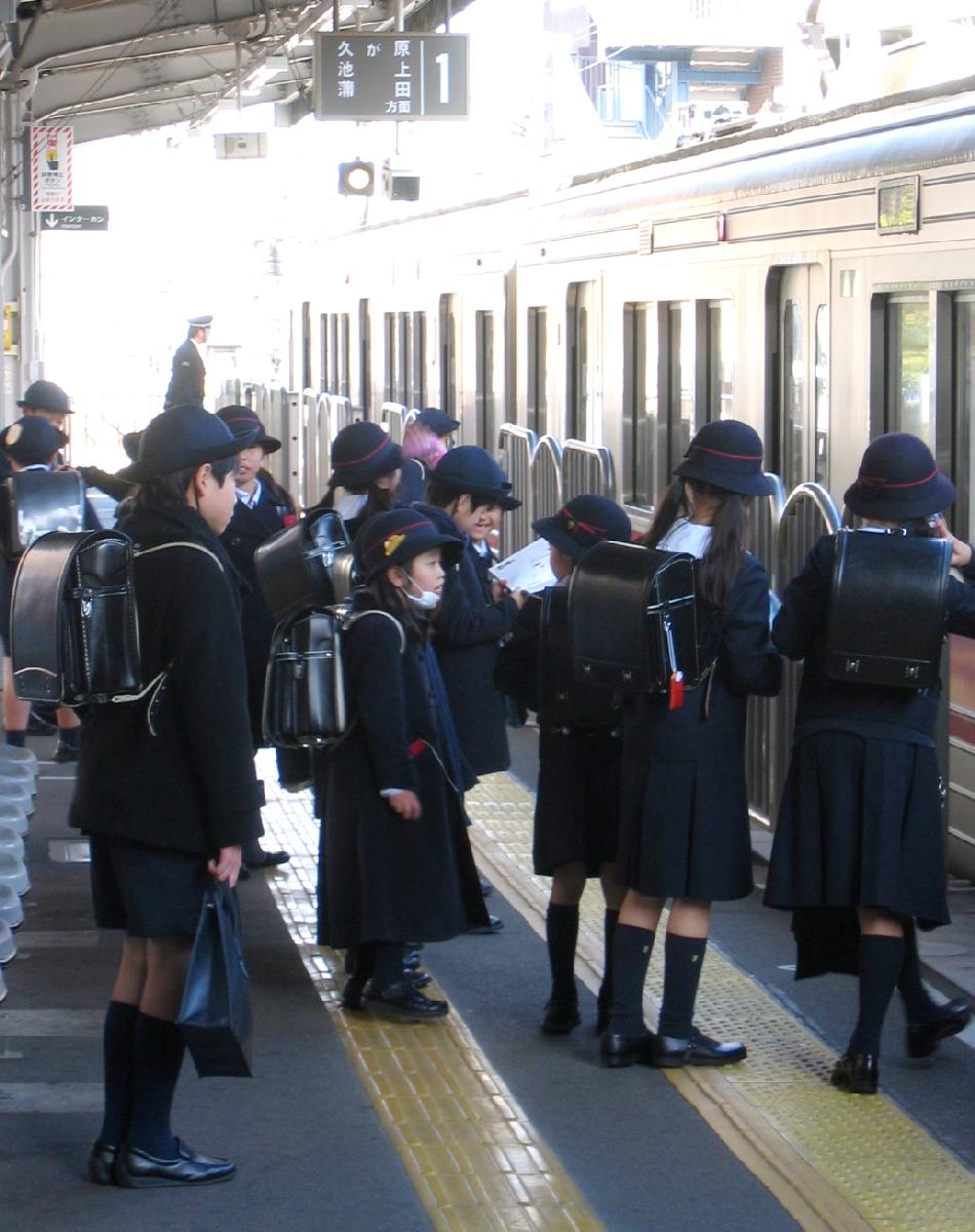 There are quite a few different styles of headwear worn at Japanese schools and most had gender connotatiins. Most schools had headwear of some kind, especially the uniform schools. And this was true for both boys and girls. Older children usually have gender-specific styles. Usually the differences are very obvious. Notice the differences in the school here. The girls have straw hats, the boys cadet caps (figure 1). In other instances the differences we see are more muted, such as using the same color. But thre are almost always differences. Here there is a wider variety of styles for girls than is the case for boys. Hats seem most common for girls and caps more common for boys. Not only are their style differences, but chin straps seem more common on the girls' hats. Many girls wear very similarly syled sailor dresses. This is most common at secondary schools, but some primary schools also have sailor dresses. The headwear to go with these dresses is quite varied. This contrasts with the fairly similar caps the boys wear with their cadet-styled uniforms.