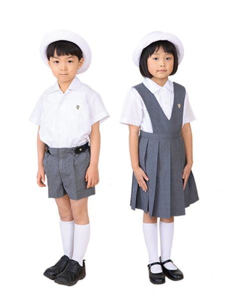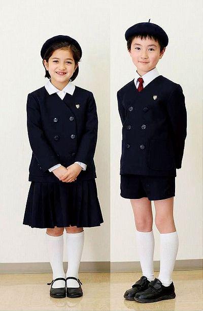 The Elementary School uniform is a traditional uniform that has continued since its establishment. It includes a beret for both boys and girls showing a French influence. Thed winter uniform is very similar for boys and girls. Both wear navy blue suits with what looks like a double breasted jacket, although we don't see lapels. The boys wear white shirts and red ties. The girls do not have nedckwear and the collar of their blouse is worn over the jacket. The primary difference is the boys wear short pants and the girls a matching gym slip jumper dress or we think skirt. Both wear white knee socks. The girls wear strap shoes and the boys regular shoes. The summer uniform is a white fabric hat, the same style that has become so popular in Japan during recent years. The brim can be turned up or down. The boys wear a short sleeved shirt and grey short pants. The girls wear a white blouse with a gym-slipo jumper dress. It is the same styke as the einter jumper only done in grey and a lighter-weight material. As with the winter unifirm the color matches. Both boys and girls werar white socks, the girls with black strap shoes and the boys with regular shoes.