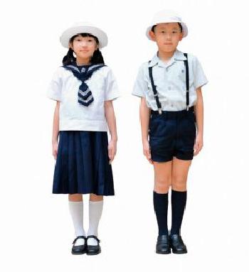 As is the standard convention in Japan, the summer uniform is more informal (figure 1). The boys wear the soft white cap, a light-blue short sleeved shirt and navy blue short pants. They may be dome in a lighter-weight material. Suspenders are shown in the school uniform image, but we believe are optional. We see the same navy blue knee socks and black leather shoes worn with winter uniform. The girls wear a sailor suit, but with white blouse and navy blue skirt. We see the same blue sacrfe with cheverons. The girls wear white knee socks with Mary Jane strap shoes.