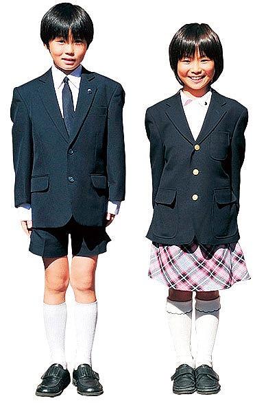 The school has a very informal summer uniform, at least for the boys. Substantial parts of the Japanese archgepeligo have warm climates. The 1st and 2nd graders wear a whuite cap. They boys wear a collared sports shirt that does not have to be tucked in with short pants with white knee socks. The girls wear a light-weight summer dress, also with white knee socks. The boy's outfit hardly looks like a uniform especially with shorts that are not ticked in. Light weight summrr dresses for thed girls, in contrast, are commonly worn in many countries as a school uniform outfit.