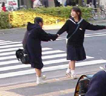 Japanese schools are know for often strictly enforcing uniform regulations. While these uniforms are quite similar there are small differences anong schools as well as the regulations concerning how the uniform is worn. Many schools let the children choose whether or not to wear winter coats. Some schools even did not have standard cpoats--although this was less likely at the schools woth the military uniforms. Often the children were allowed some choice as to the shoes and socks worn. At th school here the boys can wear either ankle or kneesocks.