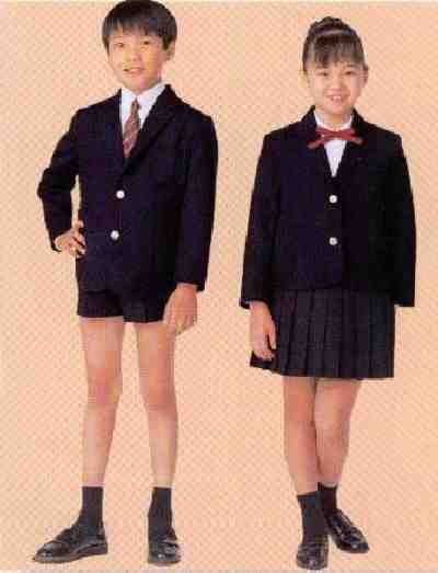 Blazers are commonly worn with caps. Often the younger children wears brightly colored caps. Younger children may wear the same cap style, but older children may wear destinctive boys',and girls' styles. Boys normally wear a white shirt, but ties are not common at state elementary schpps--except on formal occasions. This is quite different from Britain where ties are almost always worn with the blazer is pit on--except for sports. Japanese elementary children very rarely wear ties. Many schools have open-necked shirts. Ties are worn at some private elenentary schools and all secondary schools, except where the Prussian style military uniform is worn. Boys almost always wear short pamts with blazers. Often boys can wear whatever socks they want. Some schools requite white socks. Both ankle and kneesocks are worn.