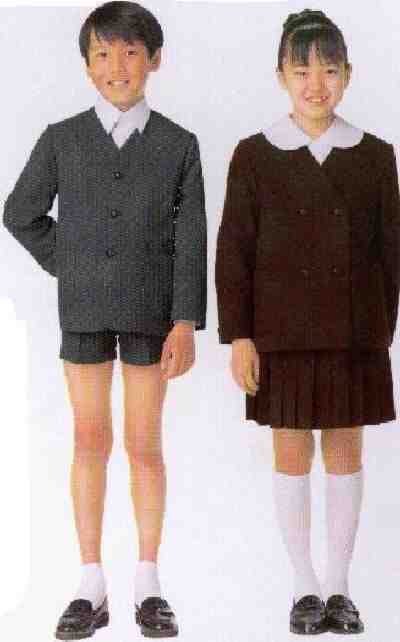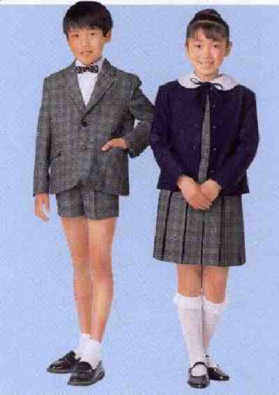 We notice that most state schools have simple uniforms, often white shirts and blue shorts. Some schools had blazers--frequently blue blazers. We do not see many state schools which have suits for uniforms. Japan is, however, a large country and there may well be some. The suits from school uniform catalogs on this page presumably were for state schools so such schools must exist. Private schools tend to have more elaborate uniforms, in some cases formal suits. There are relatively few private schools in Japan compared to the state schools. The private schools we have noted mostly have more elaborate uniforms whuch are often structly enforced. We have noted both blue and grey suits. Several private schools we have noted have uniforms with blue suits. Only a few have grey suits.