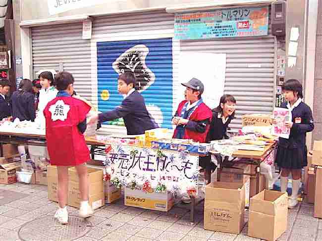 ![]() Figure 1.--Here we see children from a Japanese school. They seem to be selling magazines. Perhaps this is a fund raising project. |