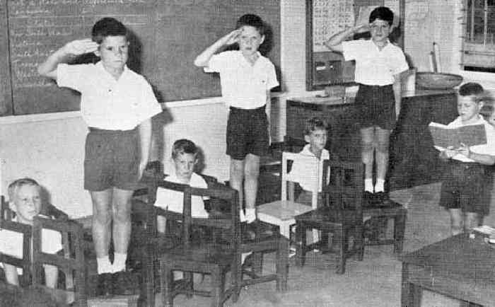 The younger boys attending the RAAF School at Butterworth in 1963 wore the uniforms seen here (figure 1). The boys wore monogramed white shirts which because of the heat were worn with open collars. Many of the boys wear white shirts without the monograms, but they all wear collared shirts. I think the boy in one oimage has a monogram on his shirt, but perhaps it is just pens in his pocket. They had matching white shorts and white kneesocks. Only the boys wear kneesocks. The girls wore white dresses with ankle socks and white shoes. This may have been the secondary school uniform. We note other photographs where the younger boys were wearing dark colored shorts with ankle socks. I'm not sure what color the shorts were, but would guess they might be blue, but there are differences in the color. This is a the grade 3 class in 1963 (figure 1). They look to be acting out some kind of skit. Notice be boy reading at right. These boys wear dark shorts and ankel socks. The older boys wore white shorts and kneesocks.