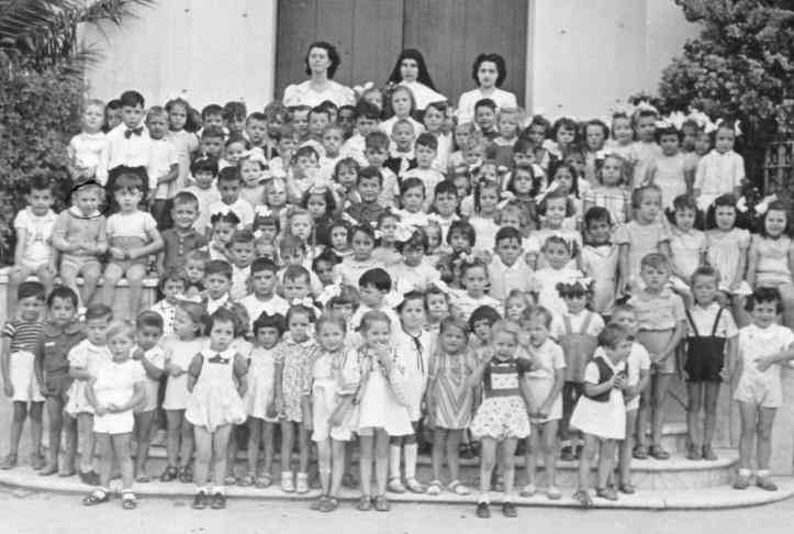 This is the Sainte Agnès School in Ferryville. We do not know much about the school. It is clearly a Catholic school. Not only does the name suggest a Catholic school, but we see a nun in the background. The children here are very young. A French reader tells us that they would be 5-7 years of age. The photograph clearly shows a larger group than a single class. This suggests to us that the children may the younger childrern at a primary school, perhaps the Maternelle and Cours Préparatoire (CP) class. The school building looks to large to be just a maternelle school. Here we see children at the Saint Agnes School. We are not sure, but this just seems to be the younger children. The girls wear little dresses. The boys wear mostly various short pants outfits, but some of the boys wear rompers. For some reason, none of the children seem to be wearing smocks. A French reader writes, "One can see here the typical look of French children during the early 1950s. In Paris, Marseille, Lyon, ect one could see the same styles. The Peter Pan collar (col Claudine) was more popular the early 1950s than in the 1940s after World War II. This style was worn by boys