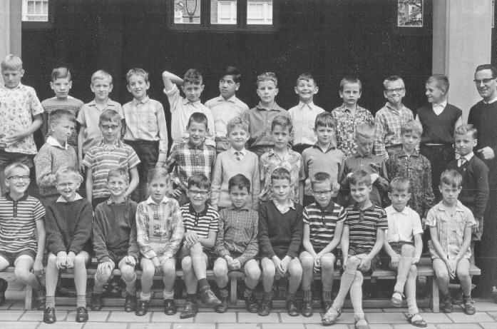 We are not positive, but believe this class portrait was taken in 1962. The younger primary children here wear a range of clothing. The boys are dressed mostly casually, but two boys look to be wearing bowties. Several boys wear sweaters, both cardigans and crewnecks. Most of the boys look to be wearing short pants. One boy wears Lederhosen. I'm not sure when the phoograph was taken, but as several of the children are wearing sweaters, the weather apparently was a little chilly.