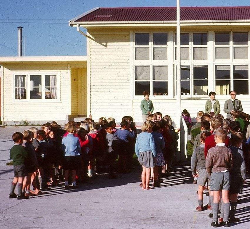The Lake Rerewhakaaitu School, is a small state primary school in Rotorua, New Zealand. Because it is so small, it had an 8 year program. Primary schools in more urban areas have 5 year programs, with the older children attending intermediate schools before beginning secondary school. Lake Rerewhakaaitu itself is a small, shallow lake in northern New Zealand, located 30 kilometres to the east of Rotorua. It is immediately south of the active volcano Mount Tarawera, and the geography was substantially altered by a major eruption in 1886. We note photograph taken in 1964 during the morning assembly. As was common at the time, state primary schools did not have a uniform, but many children wore various standard British school unifirm garments which were widely worn in British Empire/Commonwealth countries. We see many grey garment incliding shirts, short pants, and knee socks--- all part of the classic English gray school uniform. We can see a variety of colors although all the boys are wearing short pants and all the girls wear skirts. We can note also a range of footwear: brown and blak shoes, close toe sandals with socks, open toe sandals without socks, bare feet. Nobody wear sneakers, canvas shoes, or flip flops.