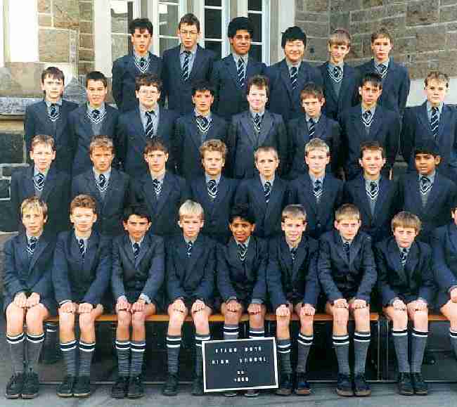 Winter uniforms in New Zealand tend to be most formal uniforms, usually the most similar to traditional English styles. The winter uniform generally consists of a tie, sweater (jumper), grey shirt, heavy-weight grey or blue shorts, knee socks, and black lace-up shoes. The sweater in particular is a good indication of a winter uniform. The kneesocks were mostly grey with top bands in the school colors. Some schools had black and light-blue kneesocks. Some New Zealand schools also have suits and blazers worn during the winter, but this is most common at private schools. There were, however, some state schools that had such formal uniforms. The school seen here is a state school on South Island. The boys wear grey short suits during the winter.