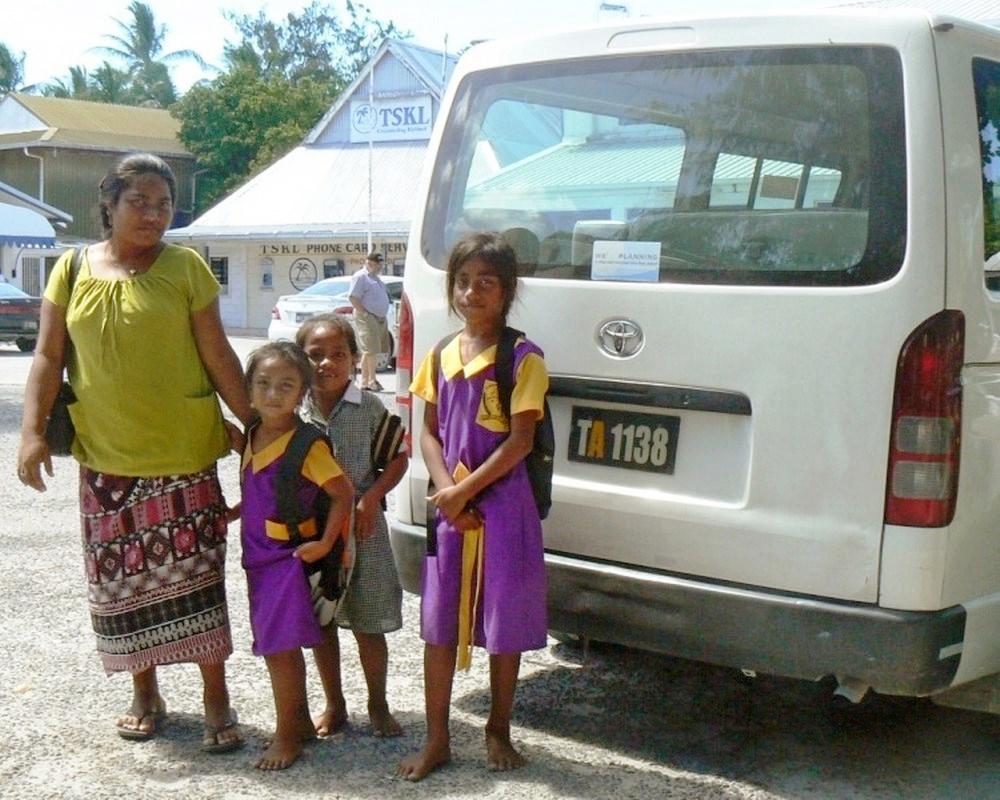 Primary education is free and compulsory for the first 6 years. The Government is extendng this to 9 years. The mission schools are being integrated into the government primary school system. There are now primary schools on all the major Kiribati islands/atols. This includes Tarawa, a tiny atol where the American Marines began the Central Pacific campaign of the Pacific War. It was one of the bloodiest fights the Marines waged. Today it is a peaceful place with a small population. Tarawa is the capital island. There are some 115 in Kiribati. This is the school on Tarawa. Here we see three girls, probably sisters, on the way to school on Tarawa atoll, Kiribati. They wear purple and yellow uniforms.