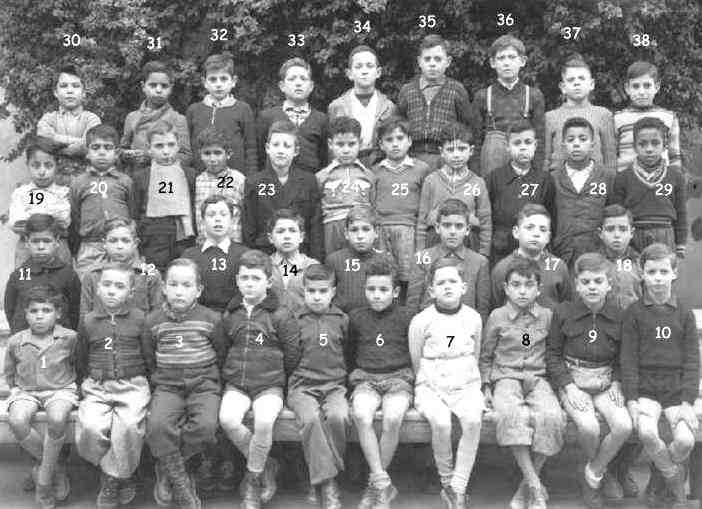 Figure 1.--This is a class at the Ecole Gambetta school in 1952. It was a CE1 class. The boys look about 8-9 years old. Most boys wear short pants. Several boys wear knickers. We only see one boy wearing a smock.