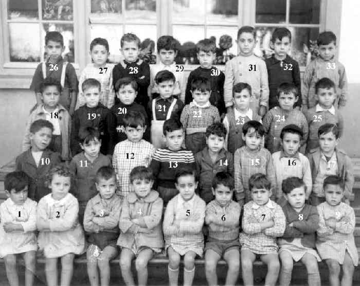 Quite a number of the children at this state school are Algerian, but are wearing French styled clothes. One boy (n° 4) is wearing a romper under his smock. Perhaps others were dressed like that.