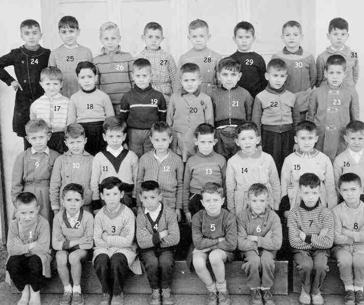 Cours élémentaire was commonly referred to as CE. Like CP, there were two classes, CE1 and CE2. We have a photograph from one class, the CE1 class in 1957. These boys would have been about 8 years old. Maby of the boys wear smocks, again in several diffwerent styles. Many of the boys wear long rather than short pants. Here we think seasonality is a factor. Many of the boys not wearing smocks are dressed warmly. Note the wide variety in the different kinds of smocks, including both front and side-buttoning smocks.