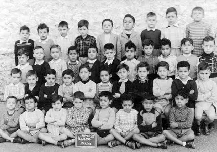 Here we see an image from the Ecole Hamma-marine. I assume that the "marine" meant that the school was along the coast somewhere. I think it was located in Belcourt (Halles centrales). I'm not sure just where that was. We have no information about the school at this time. We do have a class portrait from 1950-51. It was the entry level CP class or roughly the First Grade. Many of the boys wear smocks. Others wear shirts and short pants.
