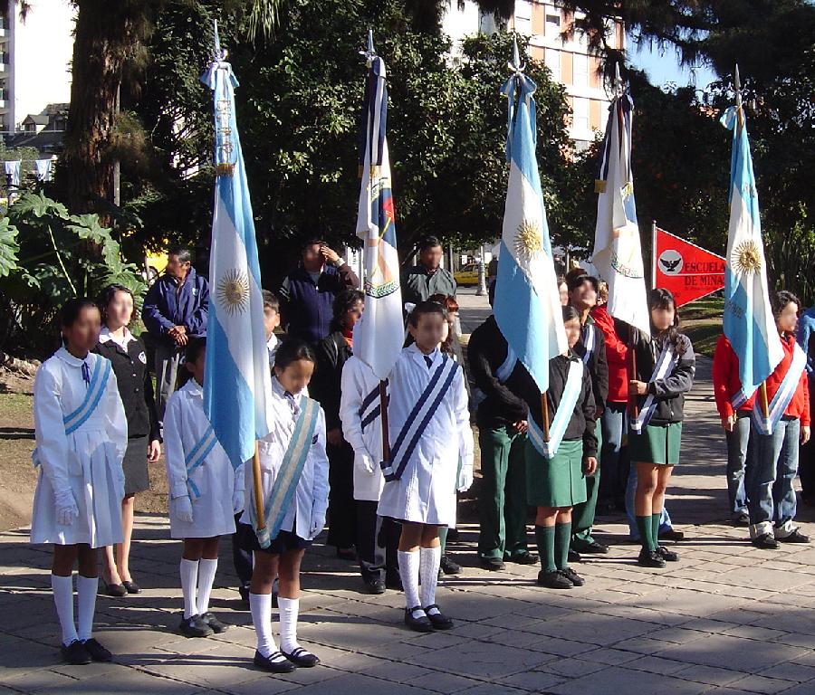 We notice a range of special events at Argenine schools, but do not fully understand them. They help to showcase the different uniforms worn at the schools as the children usully sruce up a bit for the ceremonies. A reader sent us a photograph of a flag ceremony in northern Atgentina in which three city schools participated. We are not sure just what the event was. A reader writes, "The attached photograph was taken in San Salvador, provincial capital of Jujuy Province. It is interesting to notice the different school uniforms worn by the flag bearers. The kids with white lab coat are from a public school. Next to them, the boys and girls wearing black jackets with green skirts/pants are from a private school. The next group with the red jackets and jeans are boys from a secondary level school, attached to the Univversity of Jujuy, Faculty of Mineralogy. It is also a public school, but due to the nature of their curiculum, they wear a 'rougher' type of uniform. Jujuy is the northern province bordering Bolivia and unlike other regions of Argentina, their population is mainly ethnically Aymara."
