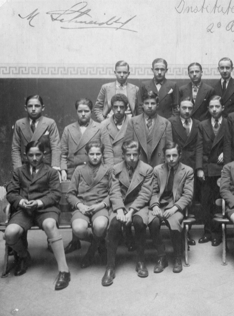 We have a portrait of a 2nd year class (2° año nacional). We are not sure why the word national is added to the year designation. They attended a secondary school, the Instituto Libre de Segundo Eneñanza--The Free Institure of Secondary Education. This seems more like a description of the school than the name. Perhps it was the only secondary school in a small town. They look to be about 13-14 years old. We do not know where in Argentina the school was located. The boys have all signed the back of the portrait. This might suggst that it was a publc school. Here we are not sure, but the word libre does suggest a public school. The portrait was taken in 1929. It might seem to be a private school because all the boys are so smartly dressed in suits and ties. But even public schools might have strict dress codes in the 1920s. The school did not have a uniform, but clearly a dress code. The boys had to wear suits to school. There are all kinds of different styles and colors. We see both single- and double-breasted jackets. Note the wide lapels, especially on the double-breasrted suits. Most of the boys are wearing neck ties . We see a few boys wear bowties and one boy seems to be weaing an ascot. The the boys are wearing short pants suits, suggesting that this was a school requirement. There are no knickers or long pants at least with the boys in front. But they are all in the same grade. That would suggest that they are the same sge, but the boys at back dolook a litte older. We do see one boy wearing long pants who we did not notice ar first because of the lightimg. Rarely is there such uniformity unless the school requires or incourages it. The boys wear either knee socks or long stockings, in this case black long stockings.